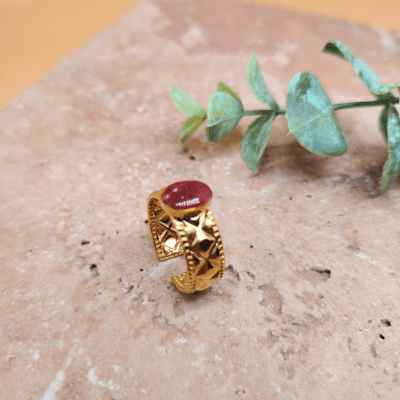 Son cabochon rouge profond, aux reflets lumineux, contraste élégamment avec la monture dorée finement travaillée. Elle apporte caractère et raffinement. Chaque détail révèle la matière en mouvement. figée dans le temps, puis sublimée par une finition soignée.
